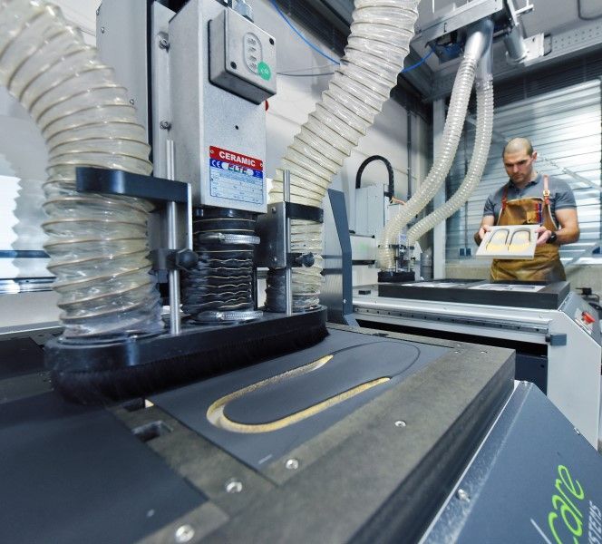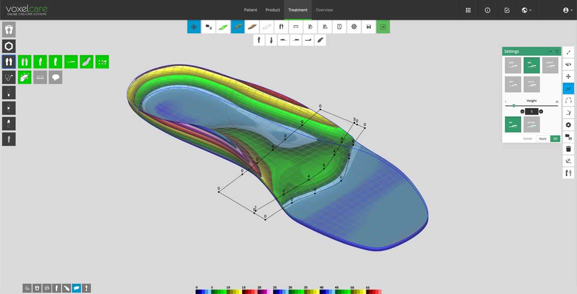 Tijdens het onderzoek wordt er een scan gemaakt van uw voeten. Aan de hand van deze scan en in combinatie met de gegevens verkregen uit het onderzoek kunnen nu podotherapeutische zolen worden gemodelleerd. De 3D gemodelleerde zoolbestanden worden naar de frees gestuurd. Afhankelijk van het voettype en de klacht wordt er een zacht, een middel-hard of een hard freesblok in de frees geplaatst en uitgefreesd. De freesblokken worden aan de bovenkant en onderkant uitgefreesd. Vervolgens worden de podotherapeutische zolen uitgesneden, worden er mogelijk nog elementen met de hand bijgeplaatst en kan de podotherapeutische zool met de hand worden afgeslepen met de slijpmachine. Als laatste wordt de podotherapeutische zool nog afgedekt zodat u er comfortabel op kunt lopen en deze goed kan worden schoon gehouden.